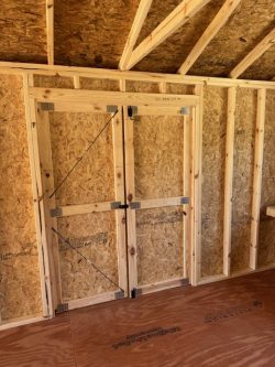 Garage shed with charcoal medal roof, 10 x 7 roll up door with ramp and diamond threshold, 7 windows with shutters, second 6′ double sideĀ door, work bench, painted gray with white trim.